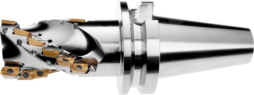 Walzenstirnfräser mit positiver/negativer Geometrie zum spannen von 28 Stück ADMX 16 oder ADEX 16 einseitigen Wendeschneidplatten · Schnittdurchmesser 80mm mit 90° Anstellwinkel und BT 50 Kegelschaft gemäß JIS B 6339 · 95mm Funktionslänge 267mm Gesamtlänge · Kühlkanalbohrung und ungleiche Teilung zum tiefen Schulterfräsen und tiefen Nutfräsen mit einer maximalen Schnitttiefe von 95mm