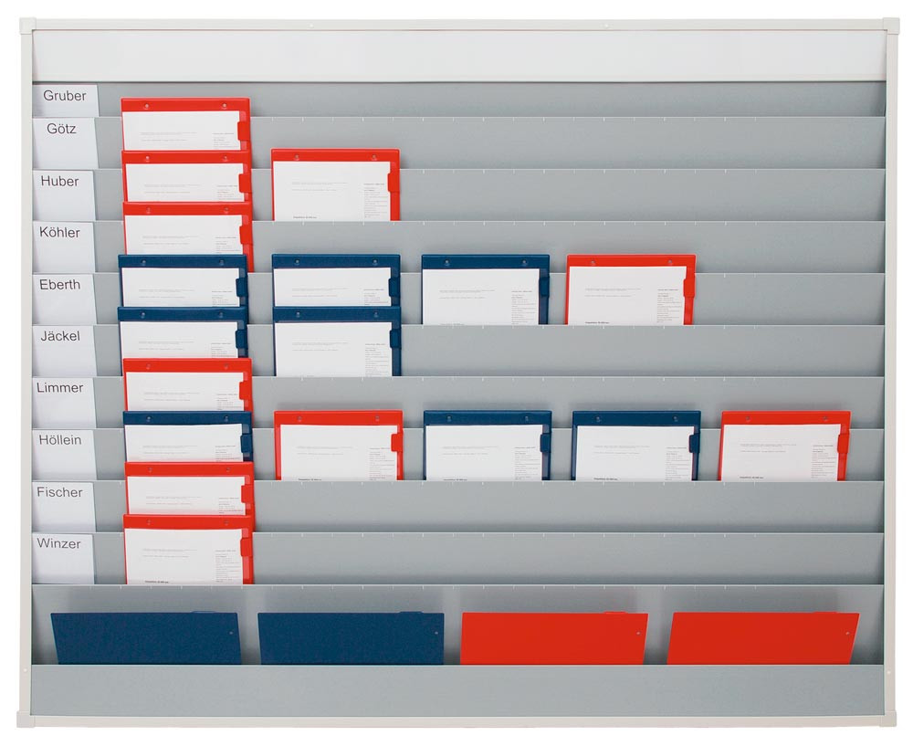 Kunststoff Polypropylen grau · sehr gut geeignet für Betriebsabläufe · mit individueller Beschriftungsmöglichkeit · für Auftragstaschen oder Belege DIN A4 · mit Ablagefach · Einstecktiefe 210 mm, Sichtrand 96 mm · Lieferung inkl. Befestigungsmaterial