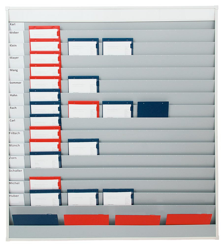 Kunststoff Polypropylen grau · sehr gut geeignet für Betriebsabläufe · mit individueller Beschriftungsmöglichkeit · für Auftragstaschen oder Belege DIN A4 · mit Ablagefach · Einstecktiefe 210 mm, Sichtrand 96 mm · Lieferung inkl. Befestigungsmaterial