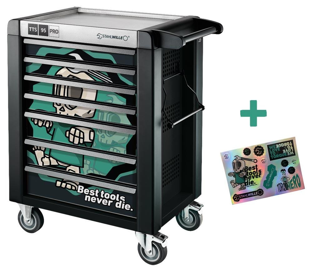 Robuster Werkstattwagen mit exklusiver UV-Lackierung im Sonderdesign "Best tools never die" ∙ 7 große Schubladen mit Vollauszug sorgen für eine effiziente Organisation von Werkzeug und Material ∙ Statische Belastbarkeit von bis zu 750 kg - die untere Schublade hat dabei eine Traglast von bis zu 45 kg ∙ Öl- und säurebeständige, kugelgeführte Leichtlaufräder (Rollen-Ø125 mm) mit Fadenschutz ∙ Beidseitige Lochraster