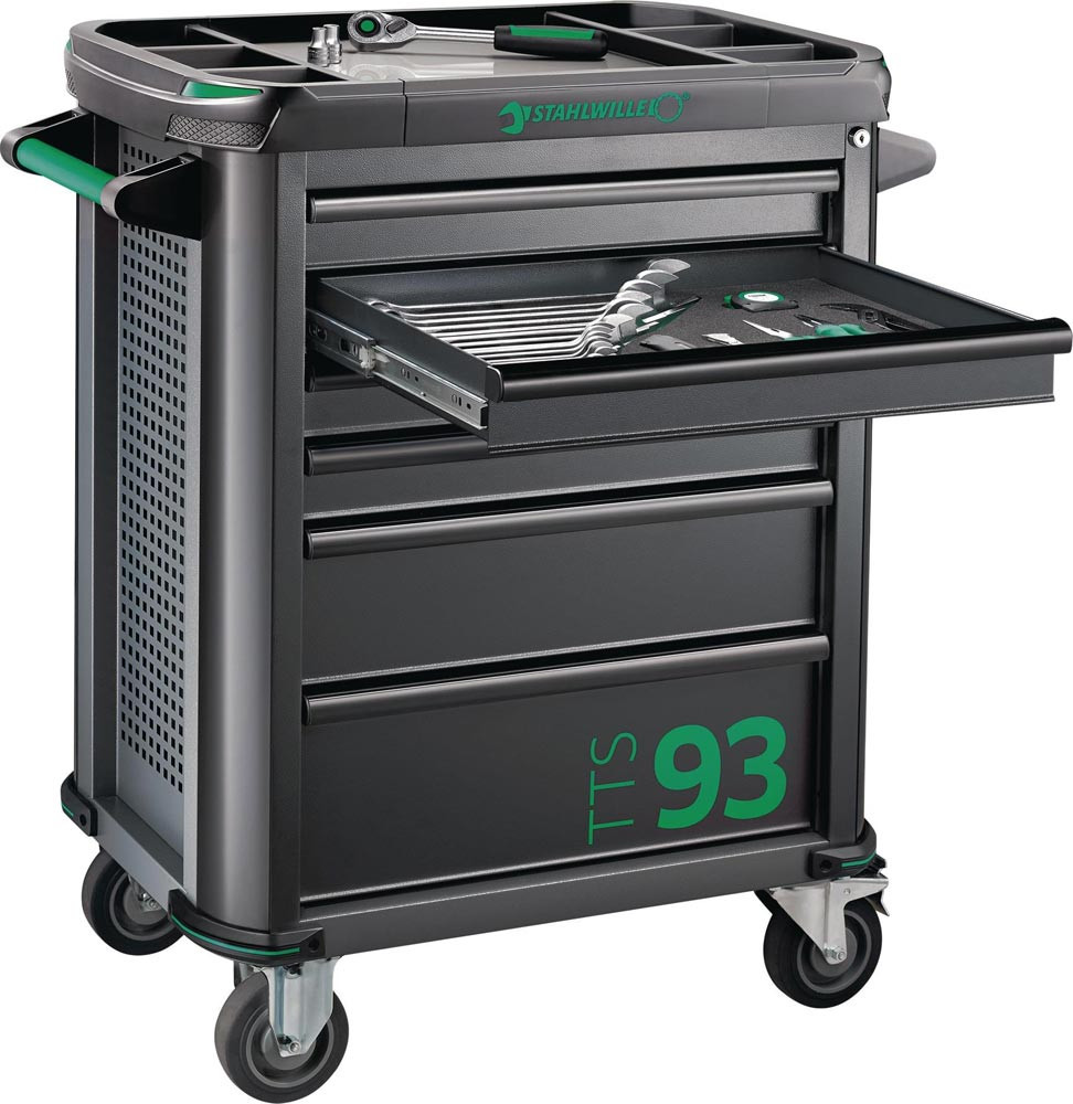 mit 6 auf kugelgelagerten Teleskopschienen herausziehbaren Schubladen mit 100 % Auszug · automatischer Schubladeneinzug · strapazierfähige Kunststoffablageplatte aus ABS · mit Fächer für Kleinteile · mit Zentralverriegelung durch Zylinderschloss (nur eine Schublade gleichzeitig geöffnet) · abschließbar mittels eingebautem Zylinderschloss mit abklappbarem Schlüssel · öl- und säurebeständige Leichtlaufräder (D.125 mm) mit Fadenschutz zum Schutz der Lager vor Schmutz und Fäden · zwei Feststellbremsen · beidseitiges Lochwandsystem für einfache Installation von Zubehörartikeln · mit Papierrollenhalter · 2 Fahrgriffe · aus Stahlblech